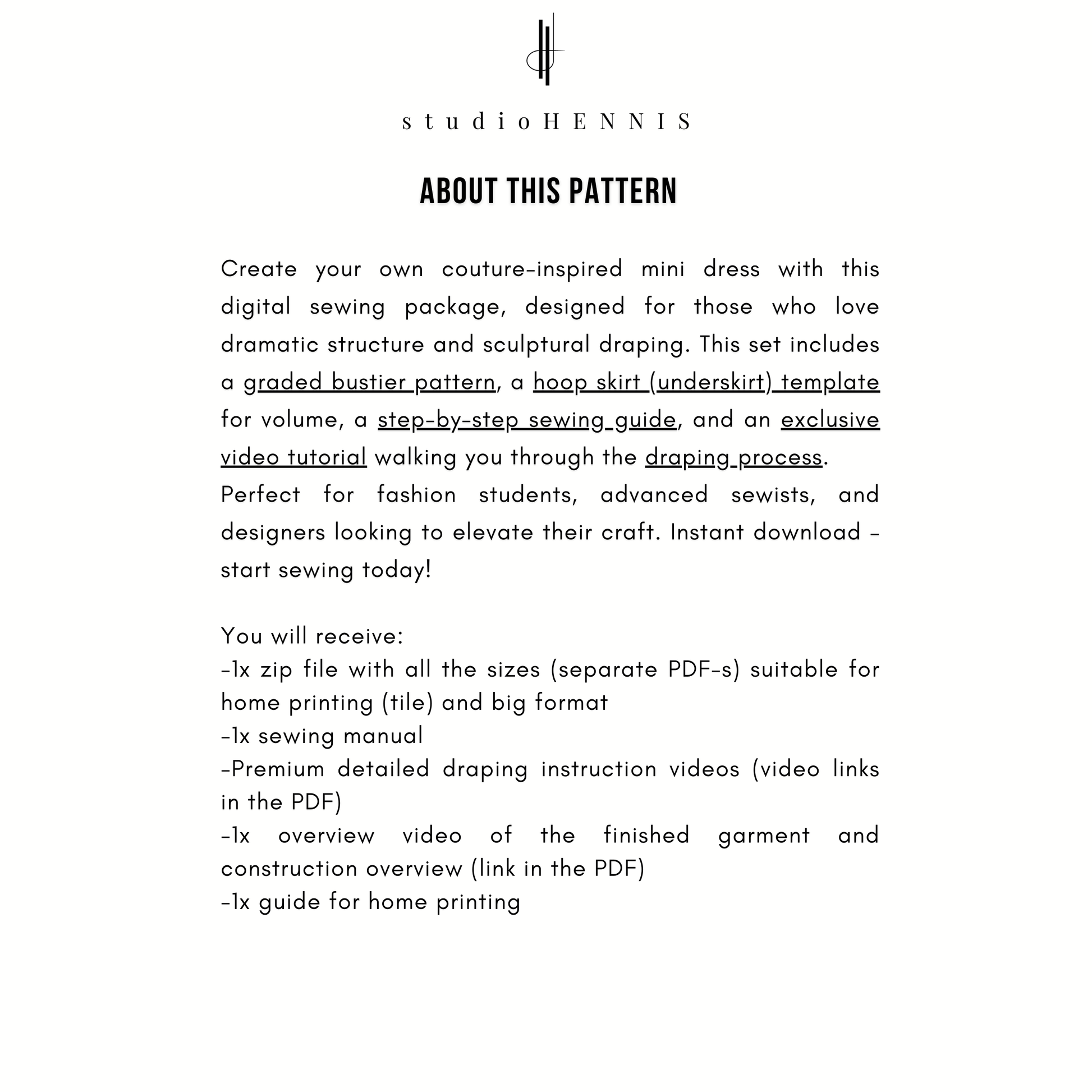 Create your own couture-inspired sculptural mini dress with this comprehensive digital sewing kit! This package includes everything you need to bring dramatic structure and elegant draping to life, whether you're a fashion student, advanced home sewist, or aspiring designer.